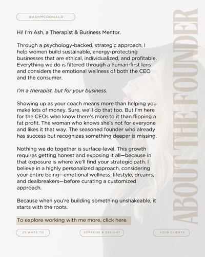 "Ash is the perfect blend of business and therapy. Just when you think you need strategy, she offers mindset shifts that you didn't even know you needed. She knows a lot about online business which of course is wonderful but what sets her apart is her level of care for you and your business on a personal level. I'd highly recommend her if you're looking for a business coach who actually gives a f*ck about you!"